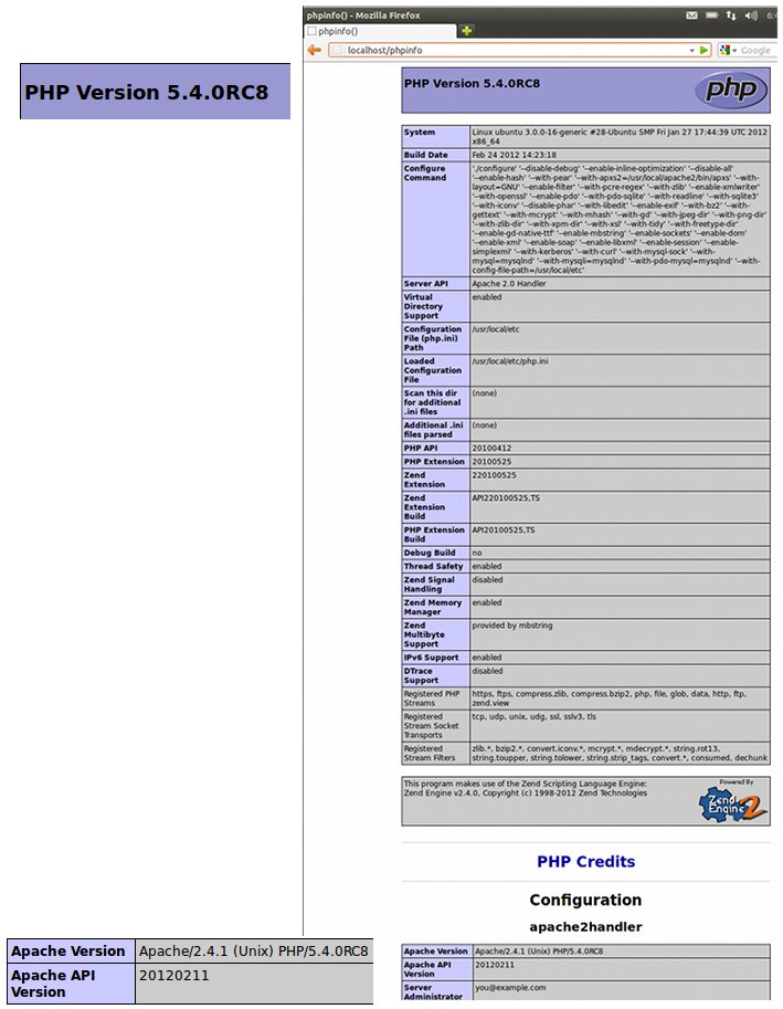 </pre> <h3 style="font-family: Georgia, 'Times New Roman', 'Bitstream Charter', Times, serif; line-height: 19px; white-space: normal;"></h3> <pre>wget http://downloads.php.net/stas/php-5.4.0RC8.tar.gz tar -xvzf php-5.4.0RC8.tar.gz cd php-5.4.0RC8 './configure' '--disable-debug' '--enable-inline-optimization' '--disable-all' '--enable-libxml' '--enable-session' '--enable-xml' '--enable-hash' '--with-pear' '--with-apxs2=/usr/local/apache2/bin/apxs' '--with-layout=GNU' '--enable-filter' '--with-pcre-regex' '--with-zlib' '--enable-simplexml' '--enable-xmlwriter' '--enable-dom' '--with-openssl' '--enable-pdo' '--with-pdo-sqlite' '--with-readline' '--with-sqlite3' '--with-iconv' '--disable-phar' '--with-libedit' '--enable-exif' '--with-bz2' '--with-gettext' '--with-mcrypt' '--with-mhash' '--with-gd' '--with-jpeg-dir' '--with-png-dir' '--with-zlib-dir' '--with-xpm-dir' '--with-xsl' '--with-tidy' '--with-freetype-dir' '--enable-gd-native-ttf' '--enable-mbstring' '--enable-sockets' '--enable-dom' '--enable-xml' '--enable-soap' '--enable-libxml' '--enable-session' '--enable-simplexml' --with-kerberos --with-curl '--with-mysql-sock' '--with-mysql=mysqlnd' '--with-mysqli=mysqlnd' '--with-pdo-mysql=mysqlnd' '--with-config-file-path=/usr/local/etc'</pre> <h3 style="font-family: Georgia, 'Times New Roman', 'Bitstream Charter', Times, serif; line-height: 19px; white-space: normal;"></h3> <pre>make make install